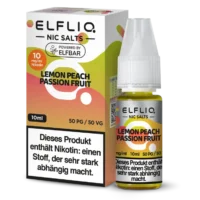 Elfliq Lemon Peach Passion Fruit kaufen bedeutet, eine harmonische Mischung aus spritziger Zitrone, saftigem Pfirsich und exotischer Maracuja zu genießen. Dieses Nikotinsalz-Liquid von Elfbar bringt dir die perfekte Balance aus Süße, Säure und Frische in dein Pod-System.